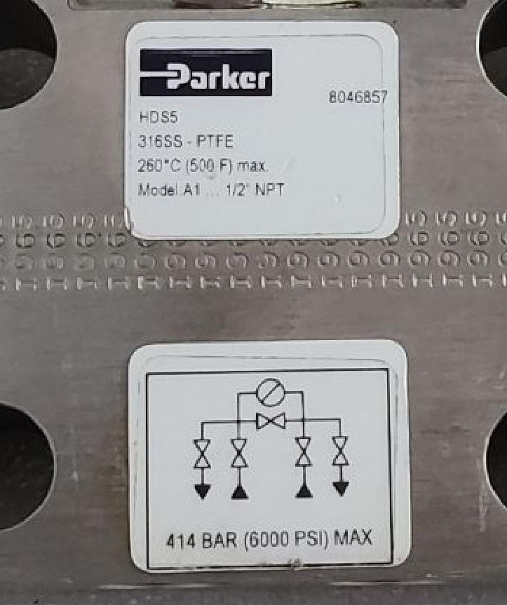PARKER HDS5 316SS PTFE A1, 1/2'' NPT Valve 414 BAR 6000 Psi max